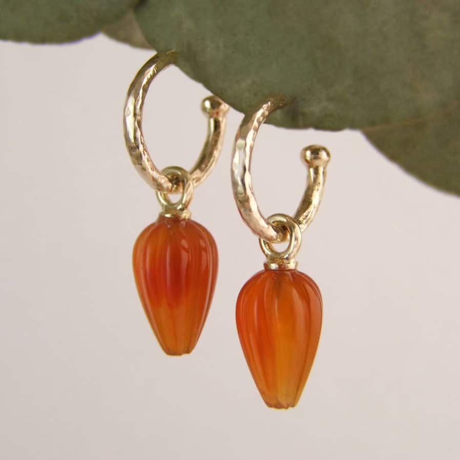 Lovely mini hoop earrings in 9ct yellow gold with carved carnelian removable drops