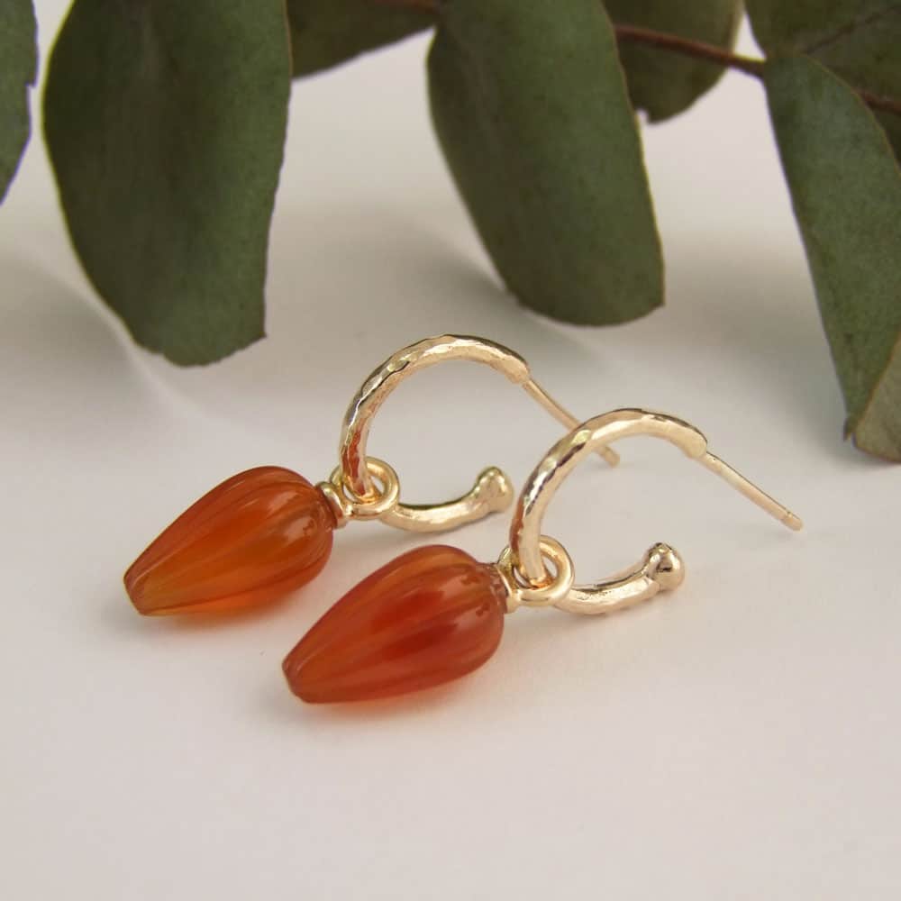 A pair of handmade craved carnelian mini hoops in 9ct yellow gold. The combination of the deep orange and gold make an elegant earring perfect for either an everyday earring or dressing up for a special occasion.