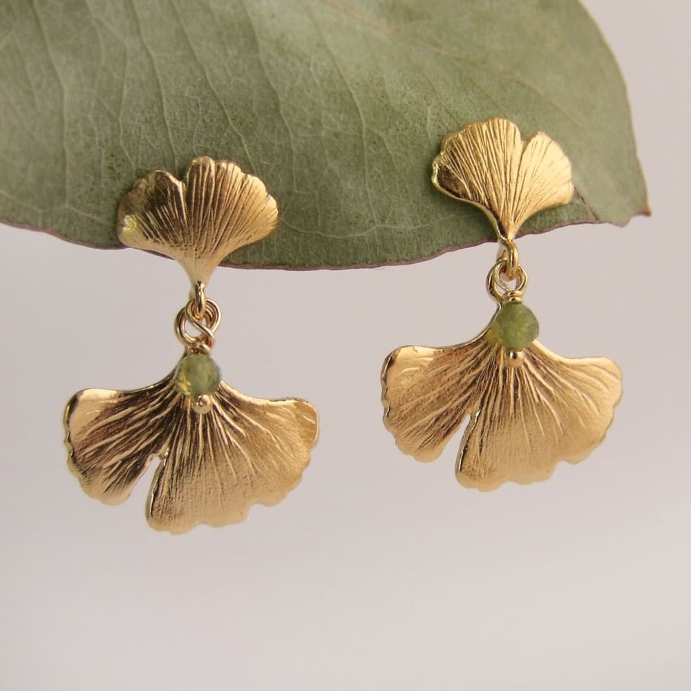 A pair of double drop ginkgo leaf earrings with tiny green tourmaline beads