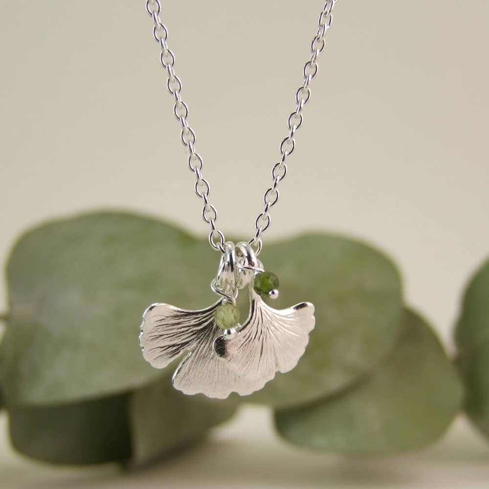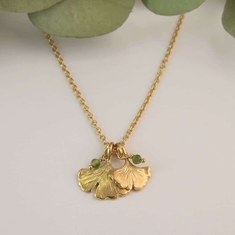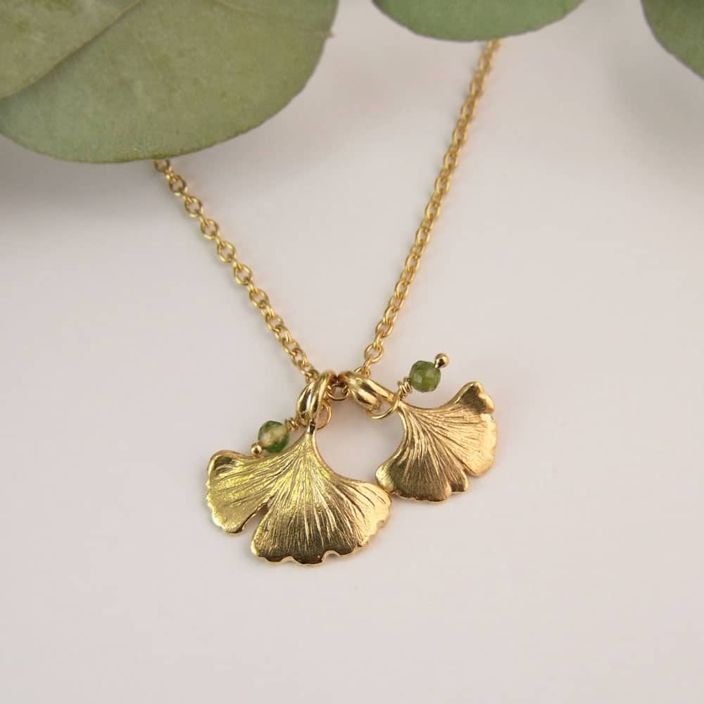 A lovely ginkgo double leaf necklace with green tourmaline beads finished on a fine adjustable trace chain