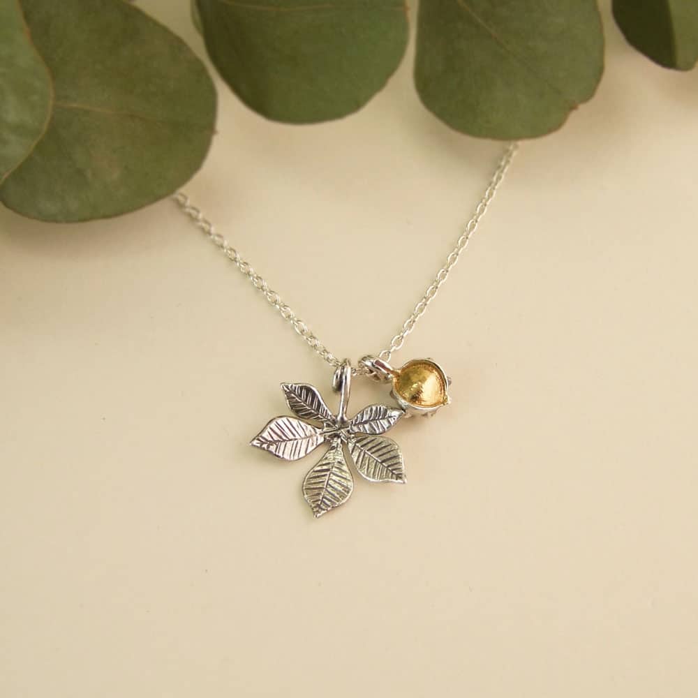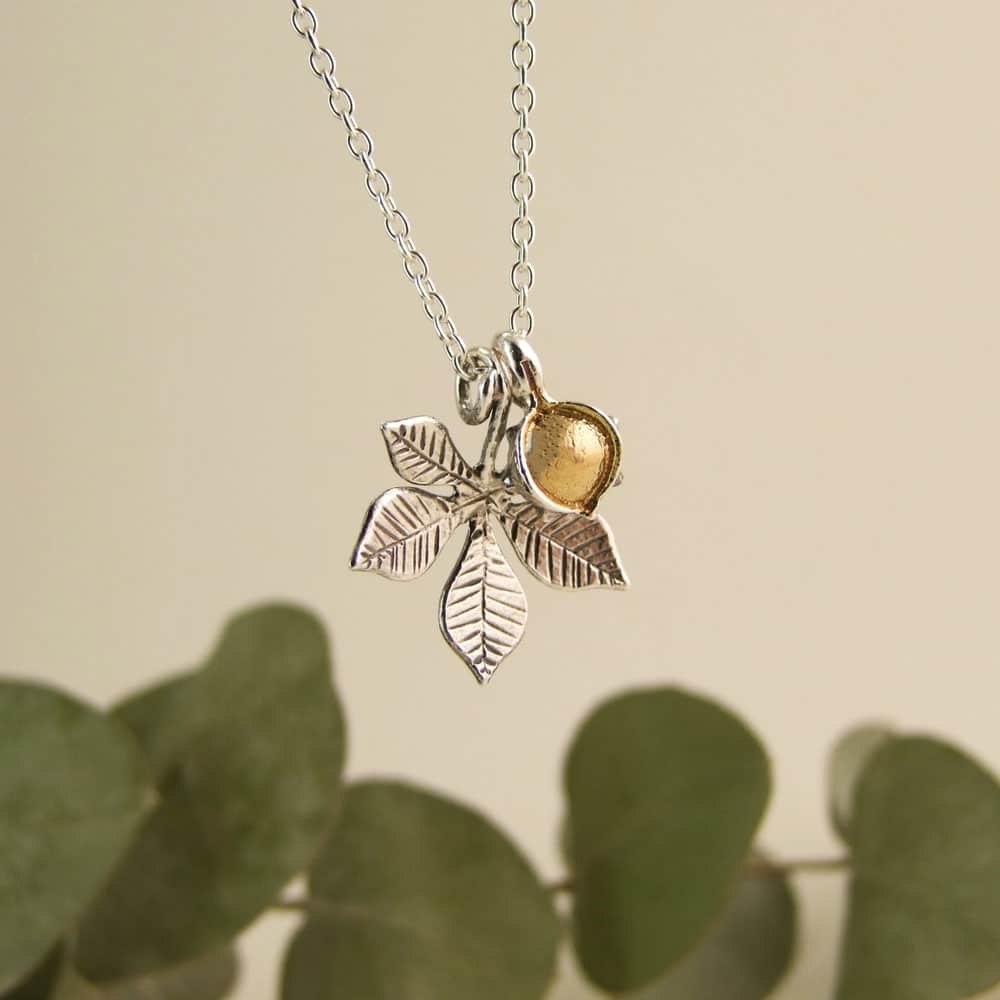 Mixed finish comes on a silver chain with a gold vermeil conker and oxidised silver leaf