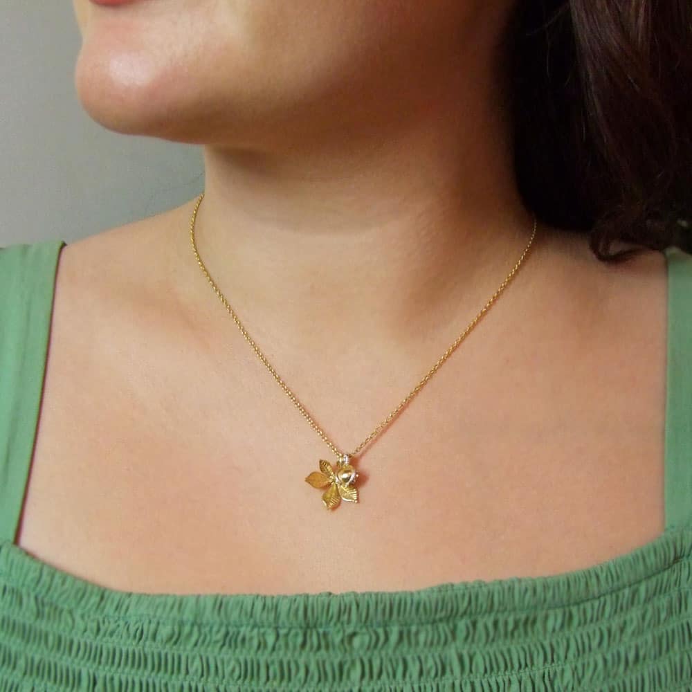 Yellow vermeil comes on a yellow vermeil chain, vermeil leaf and vermeil conker