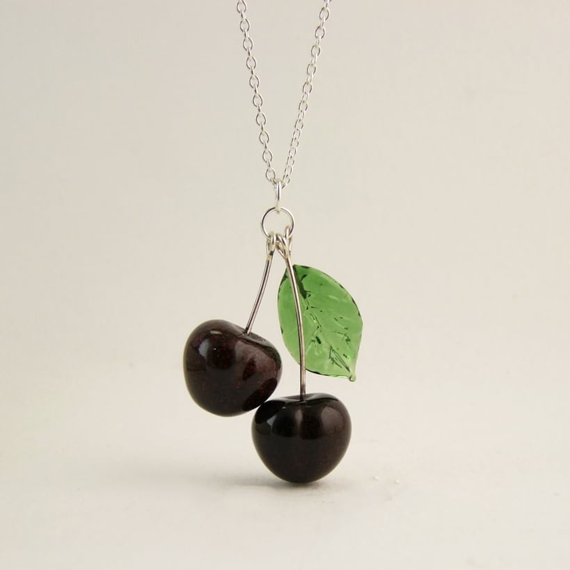 A beautiful handmade lampwork glass black cherry pendant finished on an adjustable silver chain. Inspired by vintage glass fruit jewellery from the 1930s