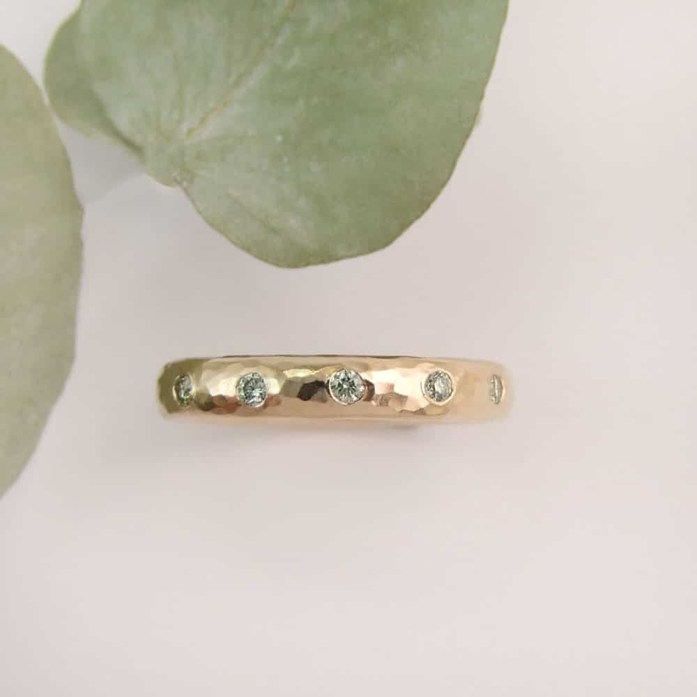 A lovely handmade mint diamond eternity ring set with five mint brilliant cut round diamonds. Finished with a hammered texture, this ring is very pretty and the diamonds are unusual and sparkle with a light mint green colour