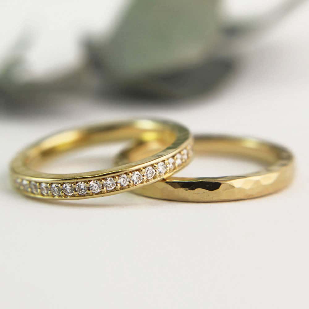 Our designs include beautiful hammered bands scattered with tiny diamonds, simple polished rings and bands with interesting finishes are popular choices at the moment but we can design and make the ideal ring for you.